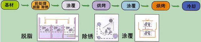 鋅鉻漿液經(jīng)浸涂、刷涂或噴涂于鐵基零件或構(gòu)件表面,經(jīng)320℃左右高溫烘烤,形成裹覆在表面的完整、堅固的防腐層,達(dá)到防護目的。